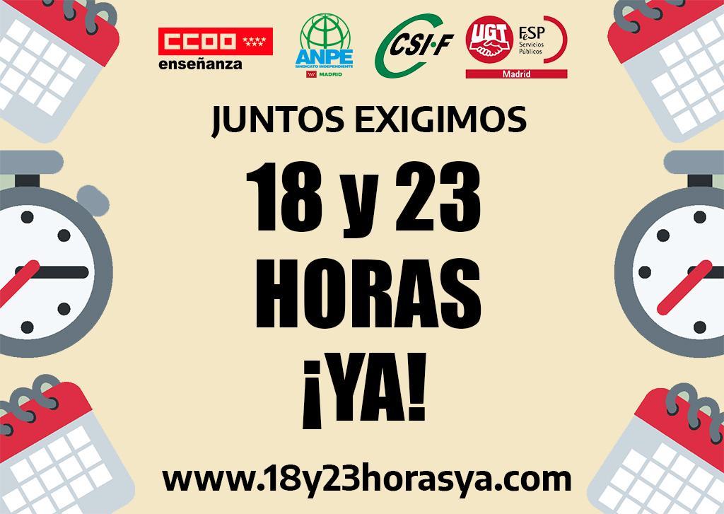 ANPE Madrid, junto con otros sindicatos, solicita a la Consejería de Educación que se aplique la Ley 4/2019, de 7 de marzo, de mejora de las condiciones para el desempeño de la docencia y la enseñanza en el ámbito de la educación no universitaria, para que las comunidades autónomas establezcan “con carácter ordinario un máximo de veintitrés horas en los centros de Educación Infantil, Primaria y Especial y un máximo de dieciocho horas en los centros que impartan el resto de enseñanzas de Régimen General reguladas por dicha Ley Orgánica”.